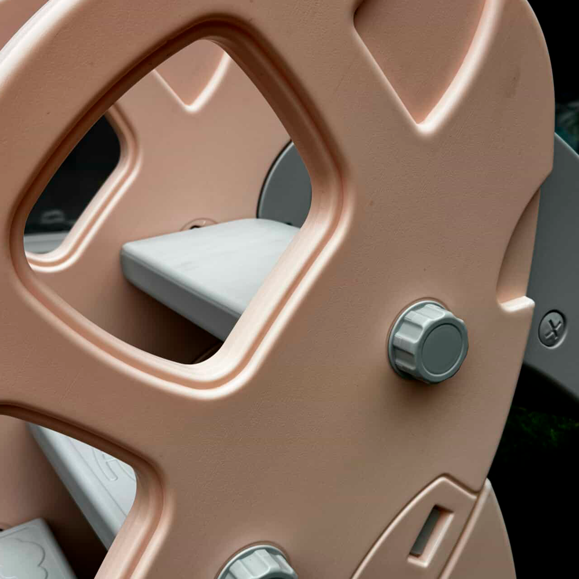 Parque infantil ideal para exteriores, incluye columpio, tobogán y caballito mecedor tiene menos de 1 año de uso, color rosa y gris.