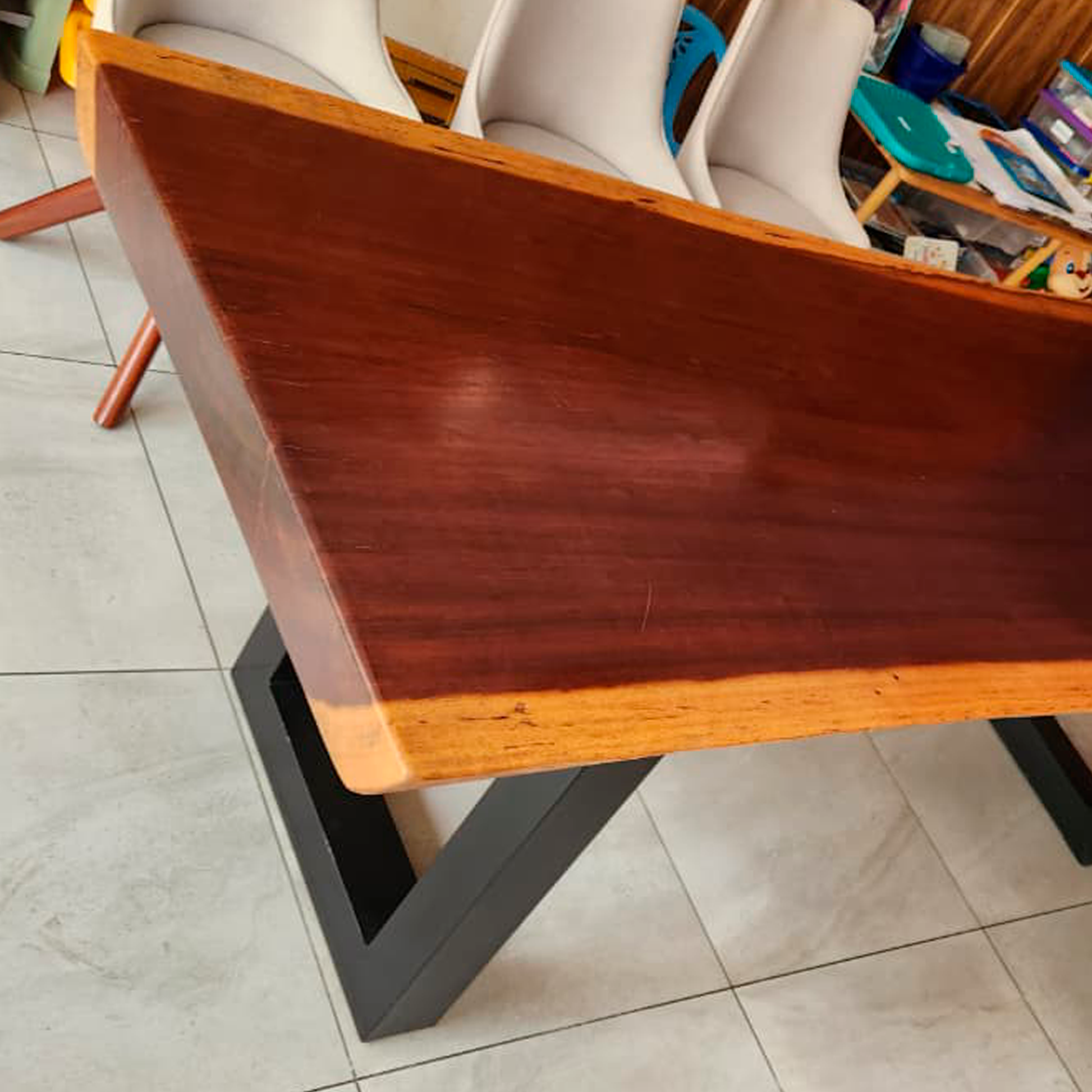 Hermosa mesa comedor de madera diseñada por la Arq. Nicole Menacho para uso interno y también para galería. Entran 8 sillas.