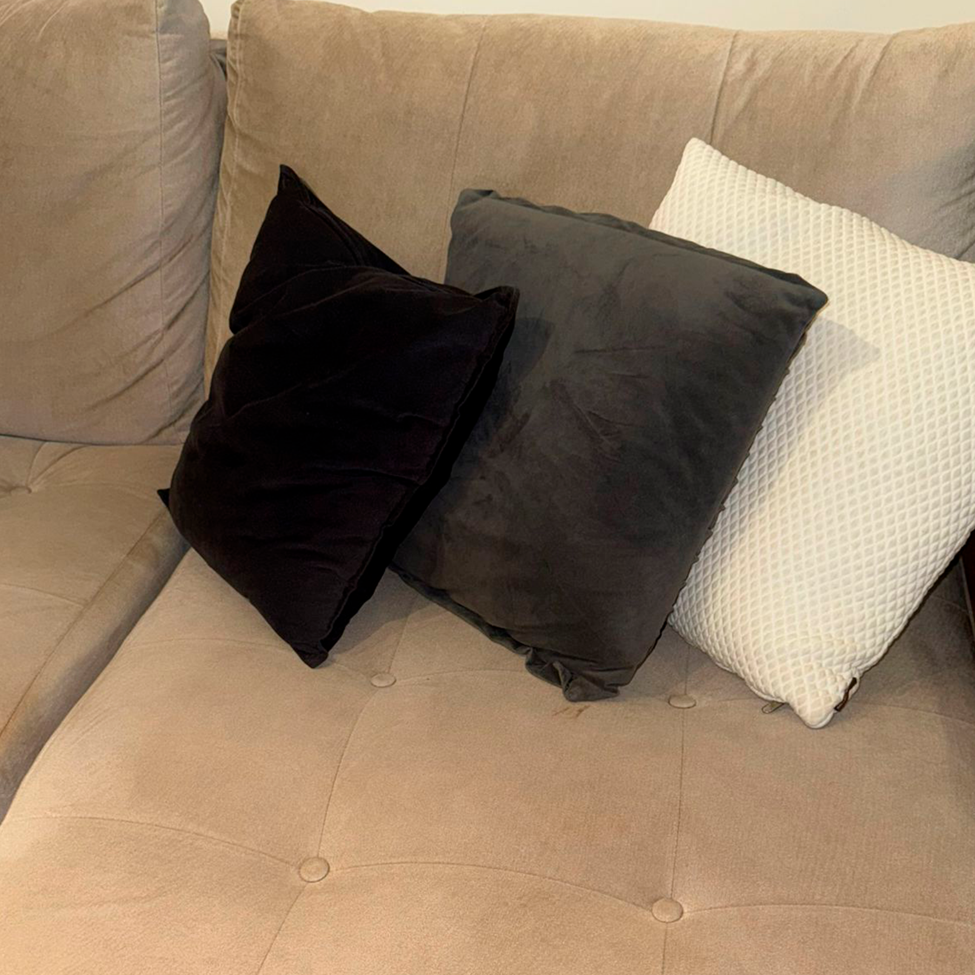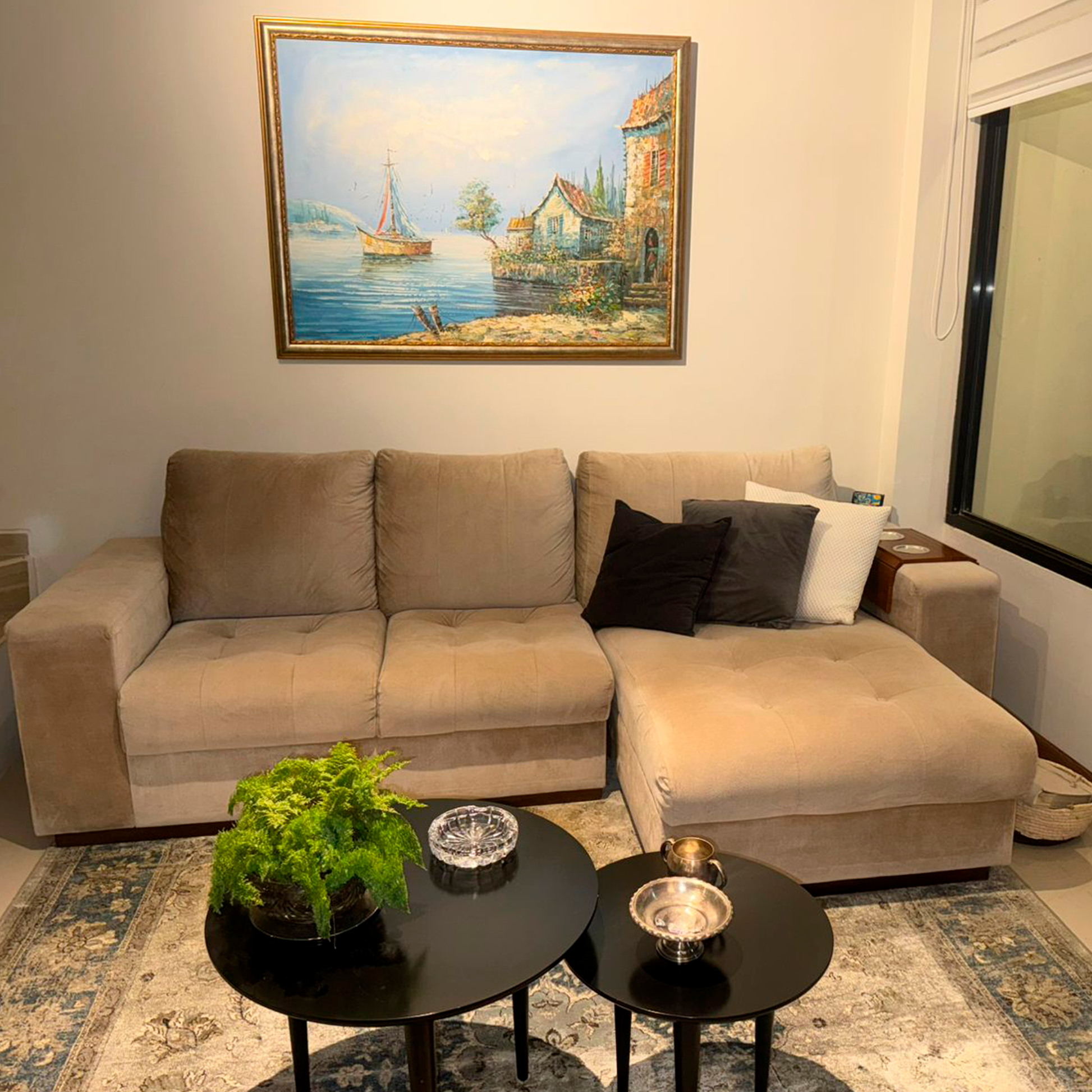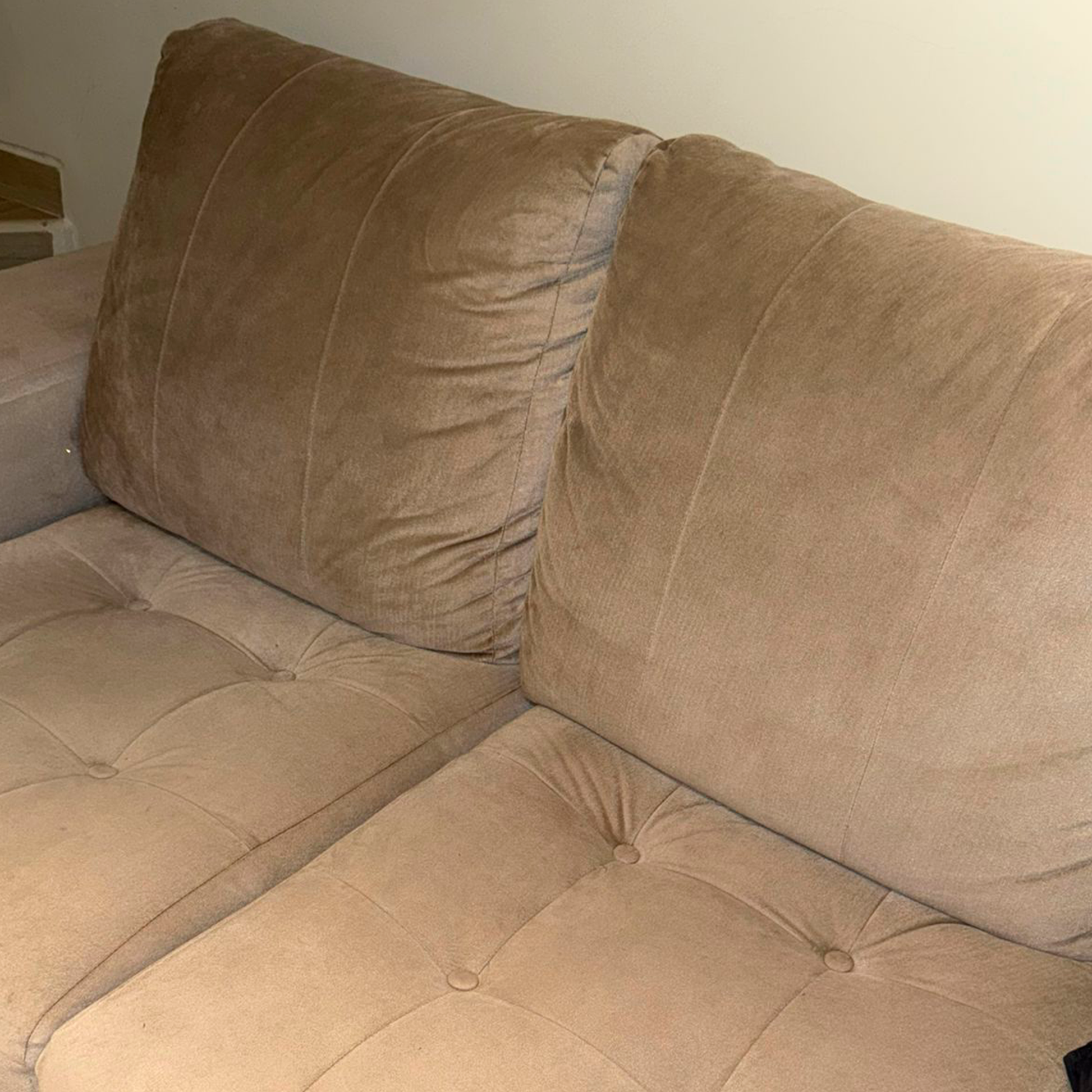 Cómodo y elegante sofá en L, tapizado en tipo cuero volcado de tono beige neutro, ideal para combinar con cualquier estilo de sala.