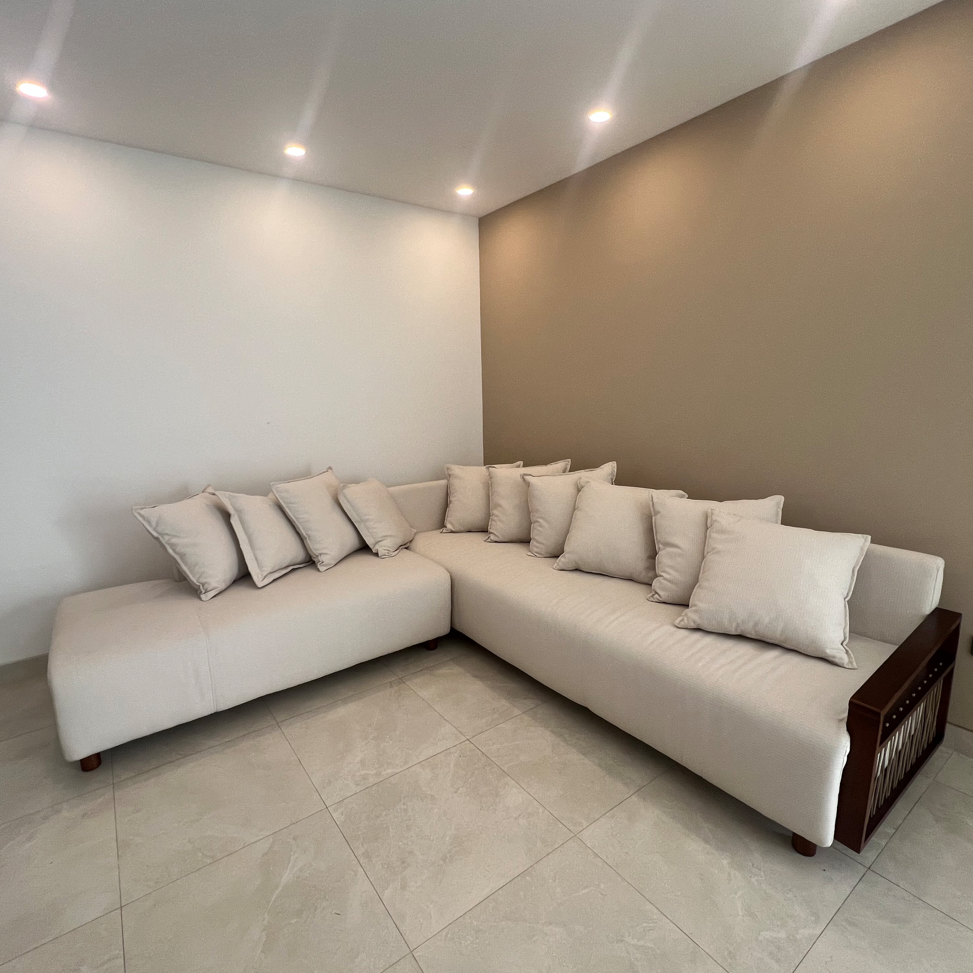 Sofá nuevo de tres cuerpos en L color beige comprado en la tienda Tua Casa.